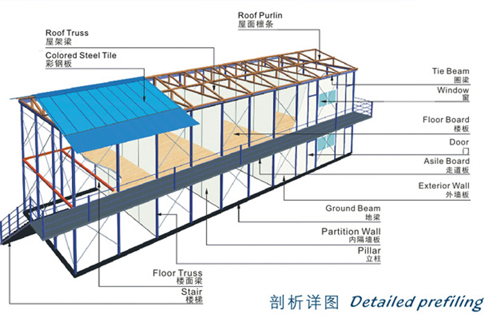temporary housing for citizens in the reconstruction area temporary office and accommodation on construction site temporary commanding station, hospital, canteen and school during the process of disaster relief temporary office building, warehouse, canteen, equipment shelter in factory temporary housing and entertainment area in resort area extended part on existing building