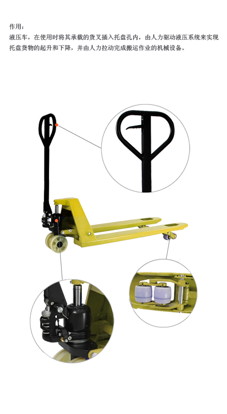 液壓車,在使用時將其承載的貨叉插入托盤孔內(nèi),由人力驅(qū)動液壓系統(tǒng)來實現(xiàn)托盤貨物的起升和下降,并由人力拉動完成搬運作業(yè)的機械設(shè)備。