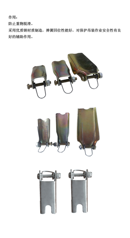 防止重物脫滑。 采用優(yōu)質(zhì)鋼材質(zhì)制造,彈簧回位性能好,對保護(hù)吊裝作業(yè)安全性有良好的輔助作用。